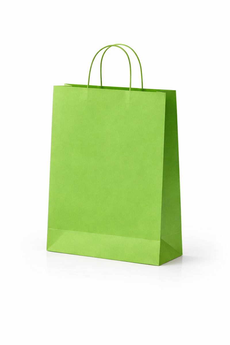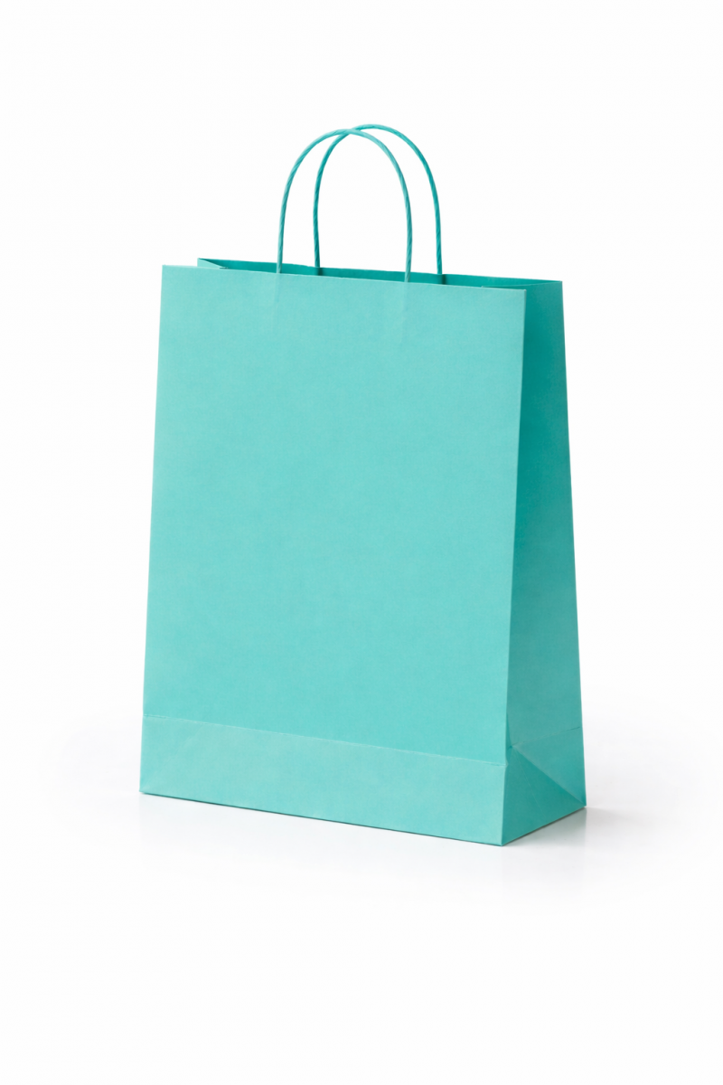 Twista paper bags are made from colored paper and feature twisted handles. They can be customized with your logo printed on one side using hot foil stamping only.These bags are colored with water-based inks and finished with a protective coating. The paperboard used is FSC-certified.