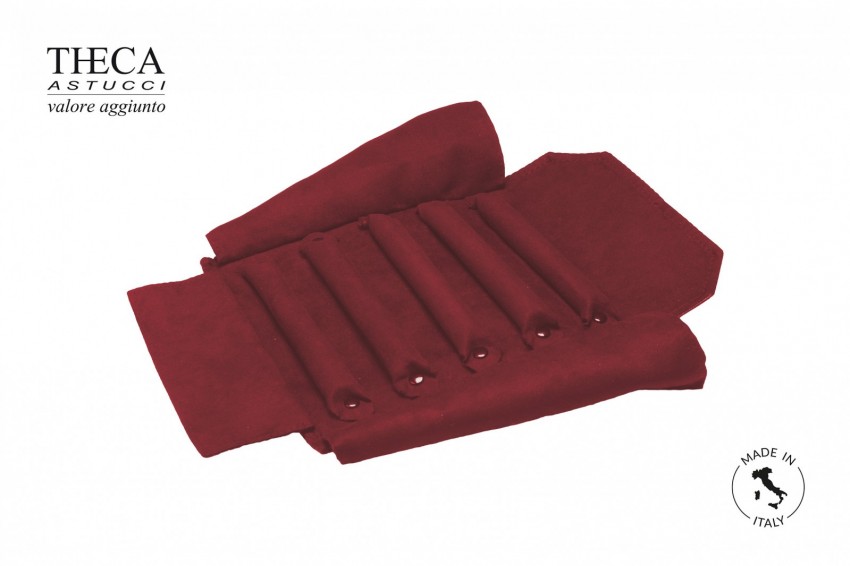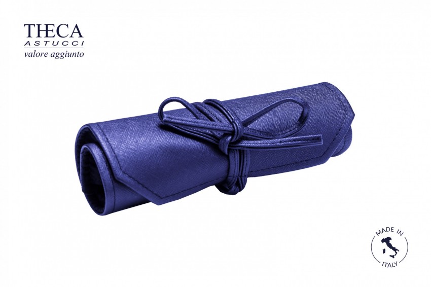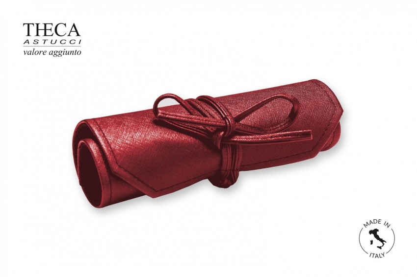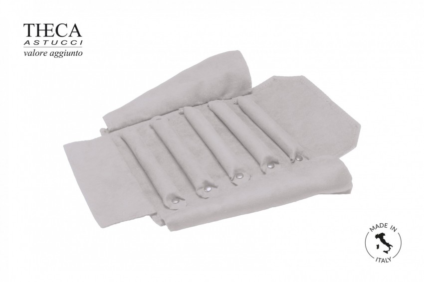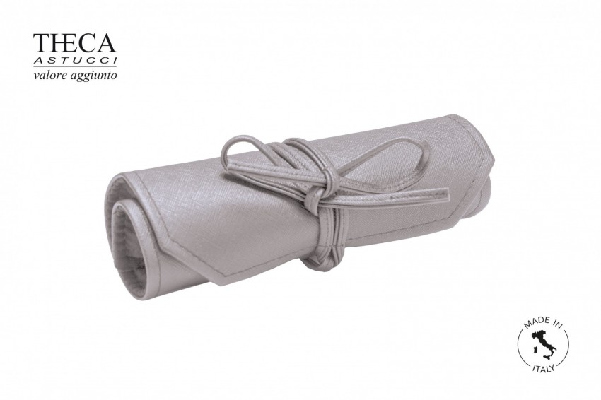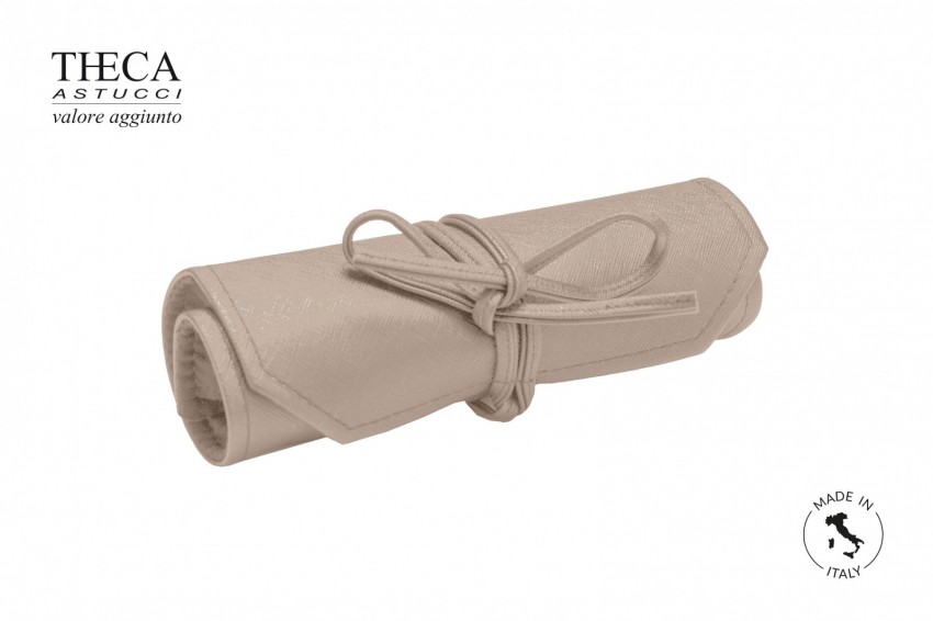 Roll for jewelry, made with embossed imitation leather and inside micro fiber. Book folded and closed with knotted belt. Outside part with label pocket.