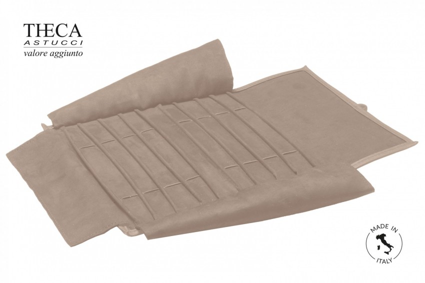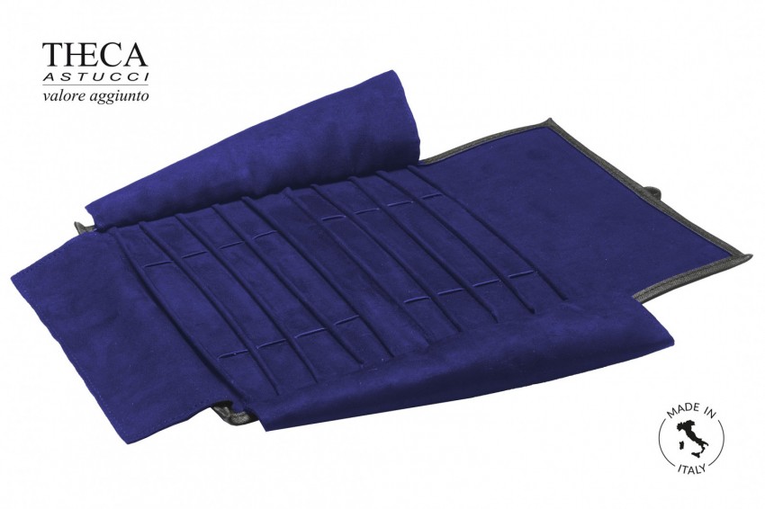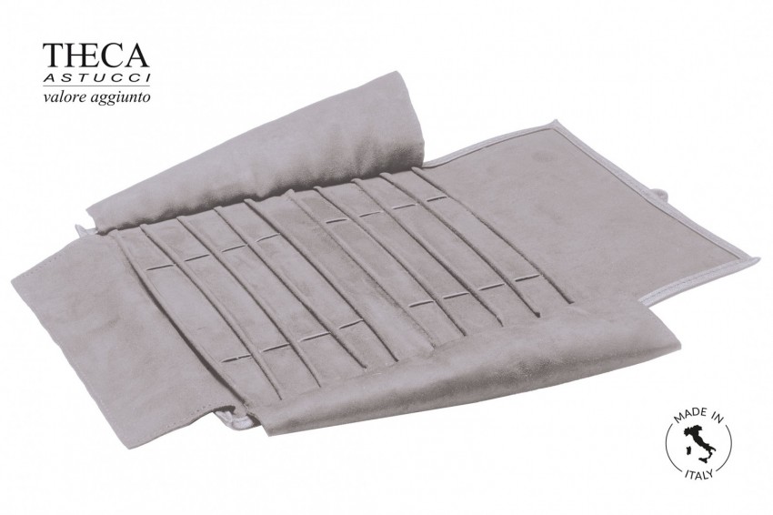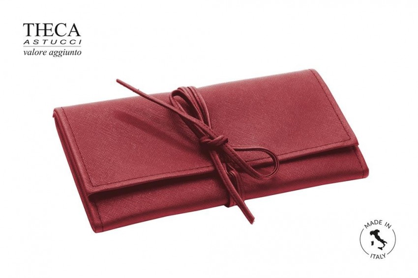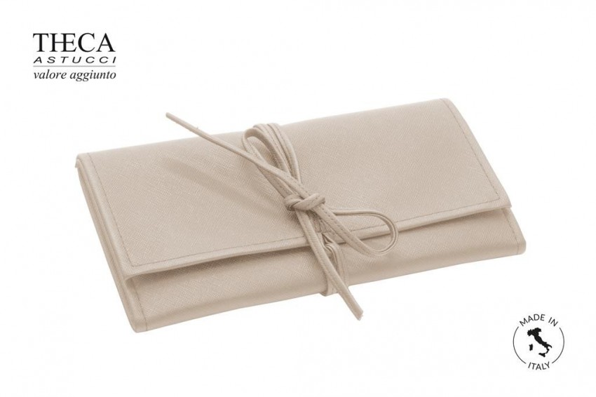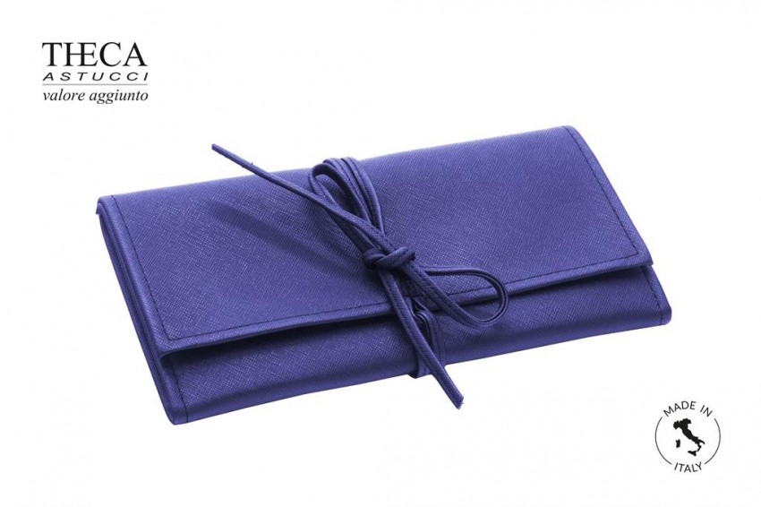 Roll for jewelry, made with embossed imitation leather and inside micro fiber. Book folded and closed with knotted strap. Outside part with label pocket.
