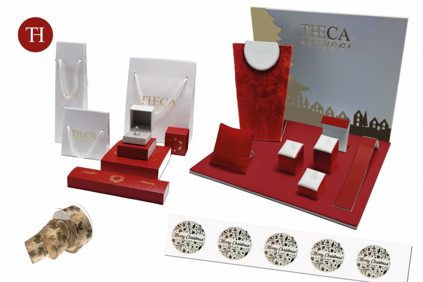 - Milano White Kit, consisting of: 36 ring/earring boxes, 24 pendant earring boxes, 12 necklace boxes, and 18 bracelet boxes, each supplied with a matching white shopping bag with closure. Customizable with hot foil printing on both the bag and the inside of the box. Delivered wrapped in a special red Stardream 120g paper sleeve, printed with gold Christmas decorations.