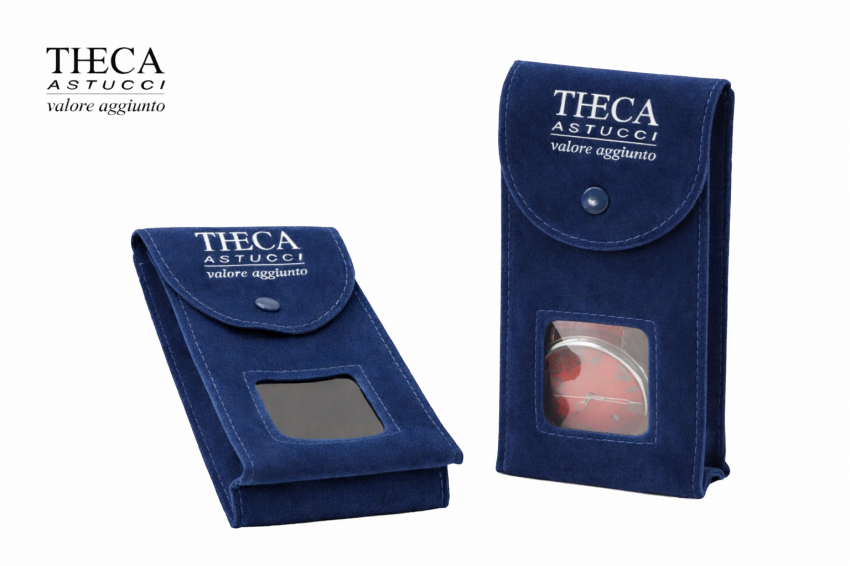 Soft stratch-proof pouch for watches, with coated snap fastener. Pad that secures the watch included. The push button and the insert are both in closets color but not matching to outside material