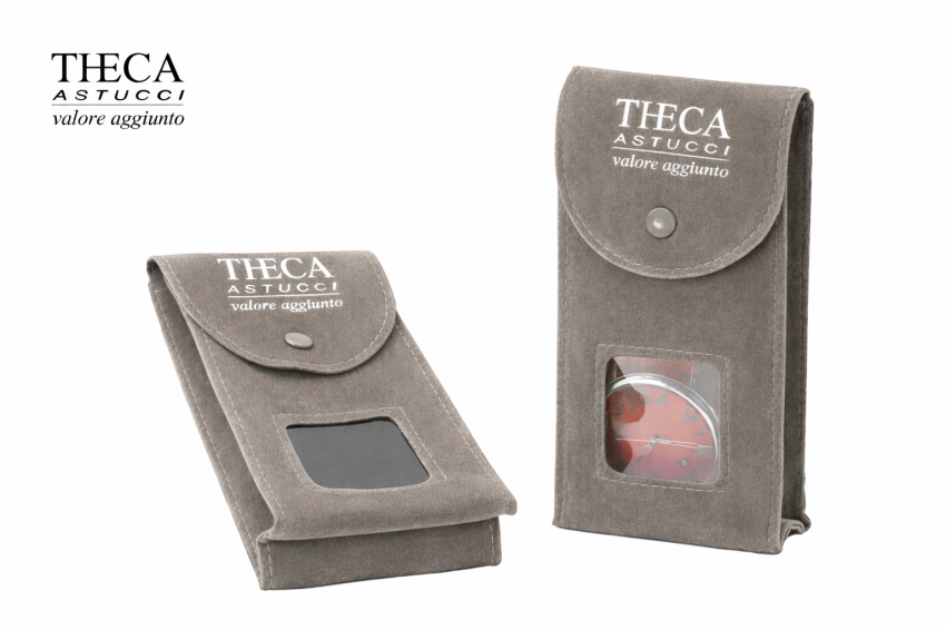Soft stratch-proof pouch for watches, with coated snap fastener. Pad that secures the watch included in similar color. Customizable with your logo on outside part.