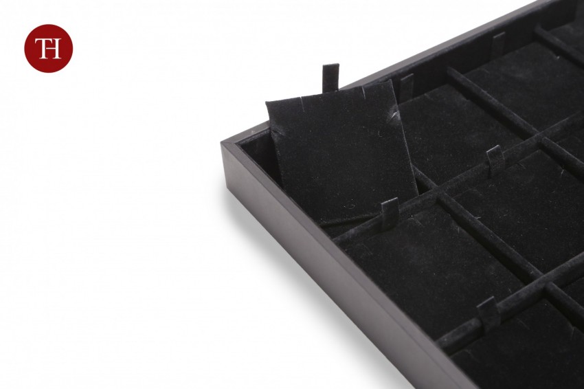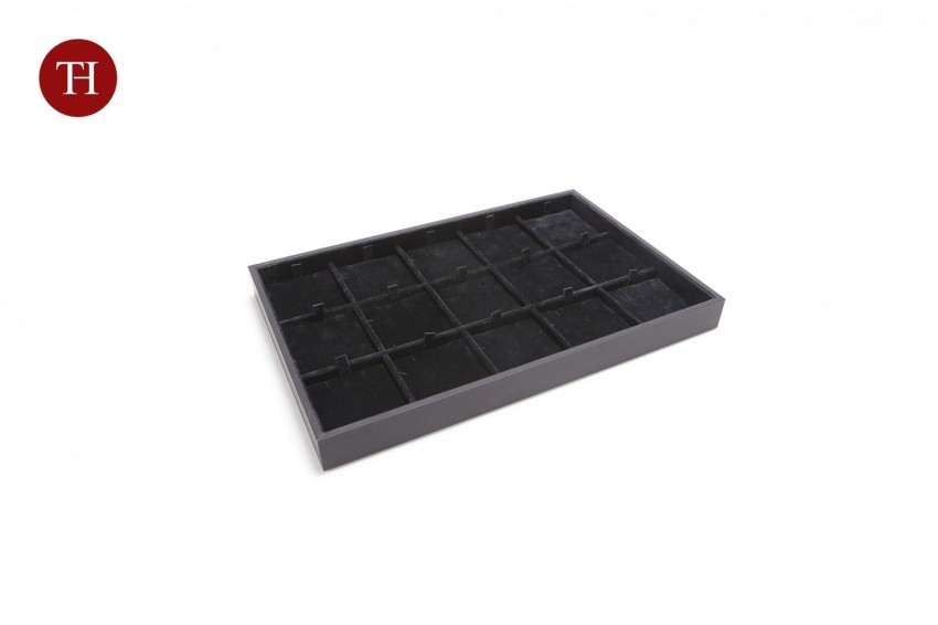 Vassoio impilabile con struttura di poliestere antiurto (HIPS), rivestito esternamente con carta soft touch nera FEDRIGONI ISPIRA ed internamente con tessuto floccato.